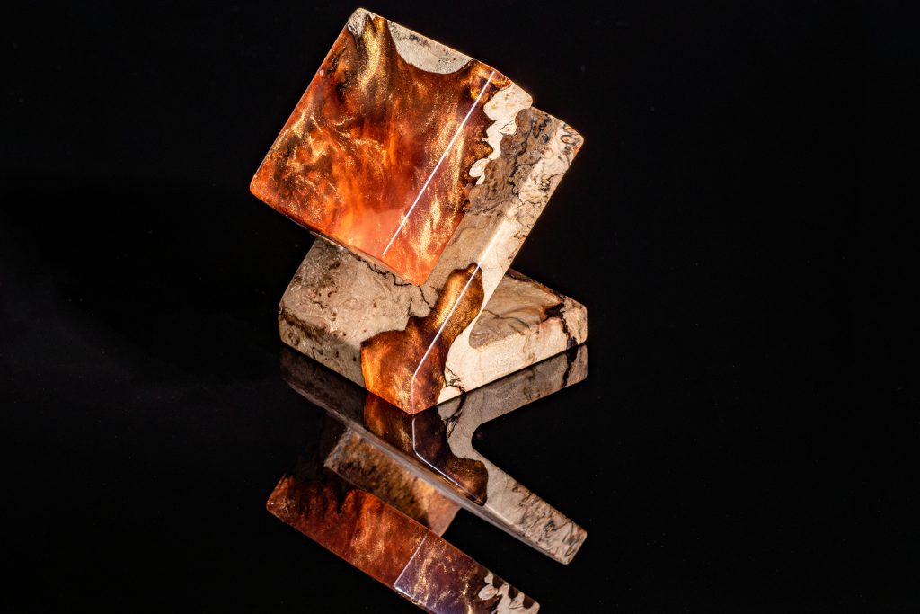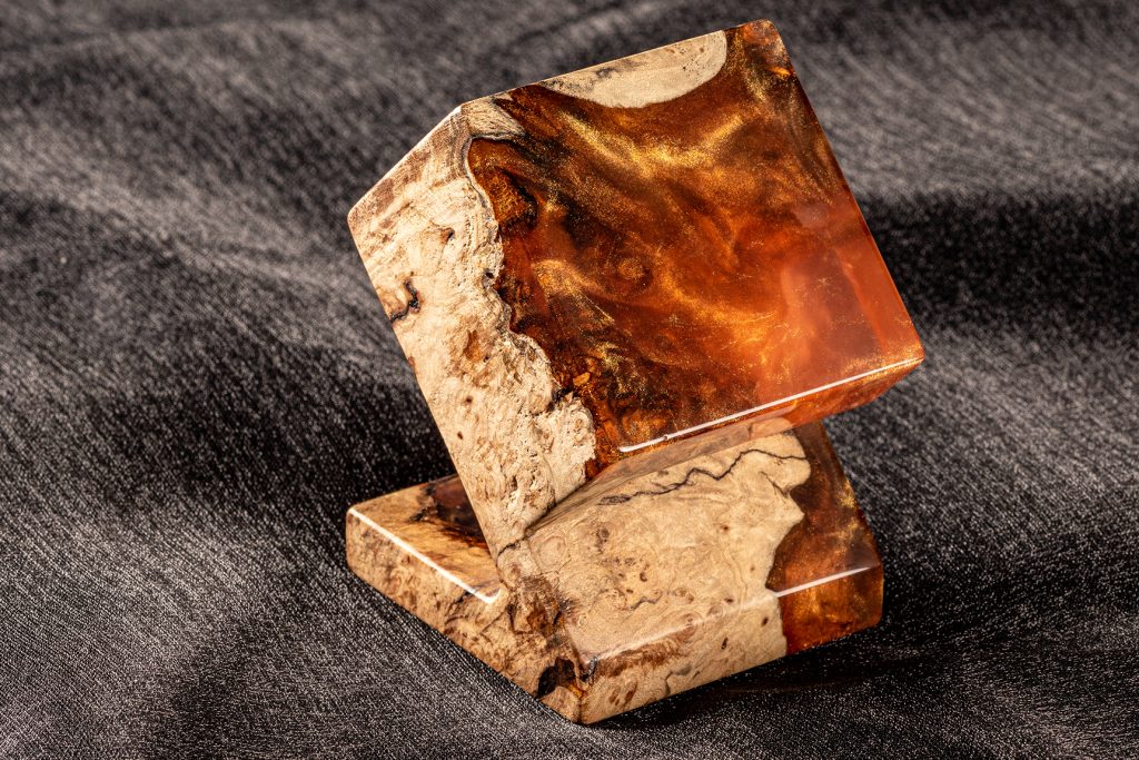 説明:温かみのあるローマンオレンジと渋めのメープルバールで高級感ある仕上がりです。今までのメープルバールは明るい色がほとんどでしたが、こちらはやや暗めの色が特徴です。木材の窪みまでレジンがいきわたり何度見ても飽きのこない作品となりました。