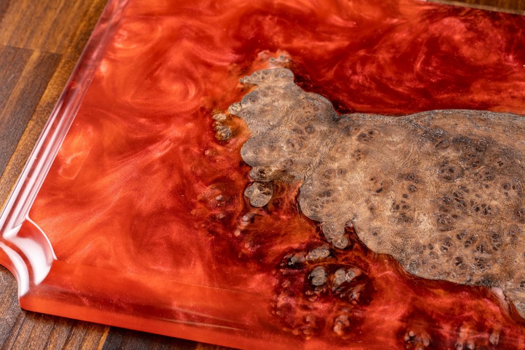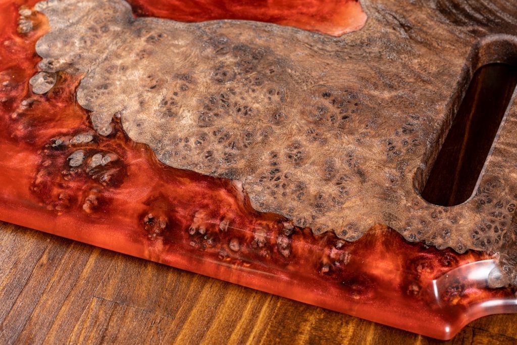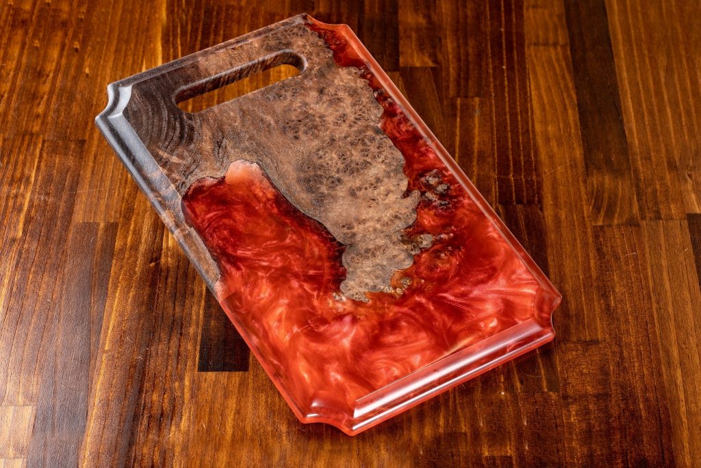 説明:今までにないカッティングボードを制作しようと普段使わない色を使いました。よくあるカッティングボードはブルー系のレジンが多く、木材も切り出しのものがほとんどです。ザイマックではこだわりの輸入木材で最高級のクラロウォールナットのバール(瘤)を使用しています。木材・レジンカラー豊富に取り揃えていますので店舗の雰囲気に合わせたオリジナルカッティングボードが制作できます。縁取りのデザインの変更も承ります。